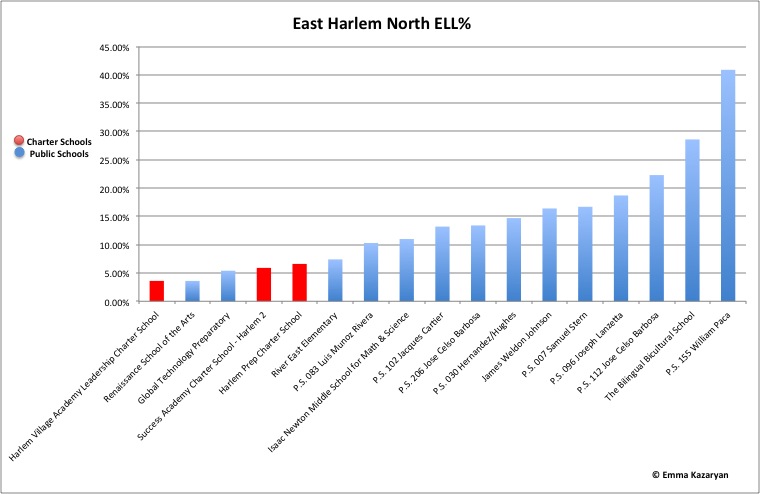 And East Harlem public schools have much higher percentages of English language learners than do their charter-school counterparts: