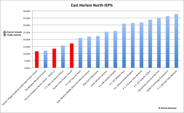The data shows that the demographic disparities cut across the board. East Harlem public schools not only have disproportionate numbers of special needs kids compared to nearby charter schools…